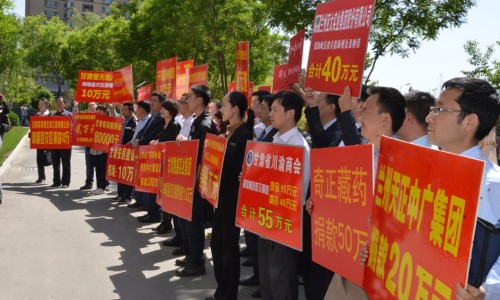 甘肅省川渝商會(huì)常務(wù)副會(huì)長(zhǎng)兼秘書(shū)長(zhǎng)張建國(guó)代表商會(huì)現(xiàn)場(chǎng)舉牌捐款捐物